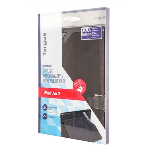Product Description: Targus EverVu Case for iPad Air 2 has hard shell back cover to keep your device secure in case. The Non-Slip PU front cover help user to fold back for easy viewing and typing. A special design non-slip grip provide additional support to your case in viewing position....