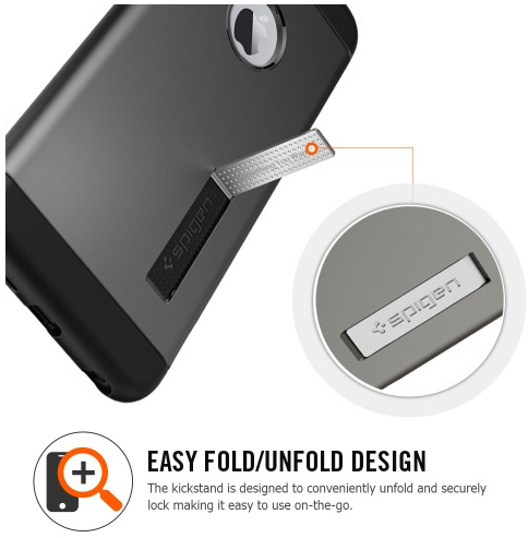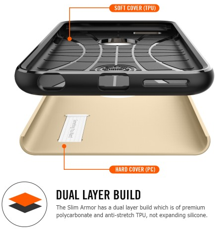 The Slim Armor case for the iPhone 6 Plus provides complete all-around protection while maintaining a slim profile. The built-in kickstand provides a hands-free viewing experience, integrated into the double layers of TPU and polycarbonate that provide protection in a form-fitted design.